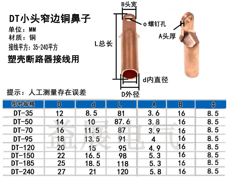 產品特點:小頭銅鼻子,小頭銅鋁線鼻子,是專為C45空開 斷路器定制的,能有效的解決普通銅鼻子太寬放不進去,用這款DTX小頭銅鼻子或者DTLX小頭銅鋁線鼻子就可以解決這個問題。具體產品尺寸和特點請于我公司人員聯系。