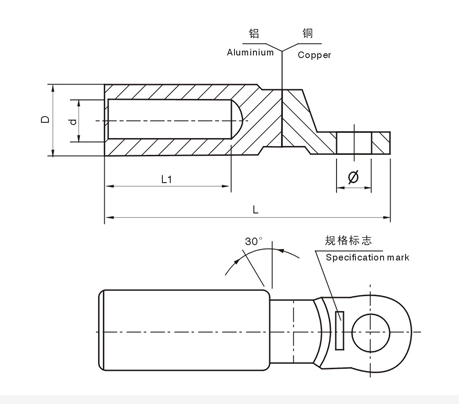 用途 : DTL系列銅鋁接線端子適用于配電裝置中各種圓型,半圓扇型鋁線,電力電纜與電氣設備銅端的過渡連接。使用鋁材為L3,銅材為T2。產品采用磨擦焊工藝制造,具有焊縫強度高,通電性能好,抗電化腐蝕,使用壽命長等等特點。